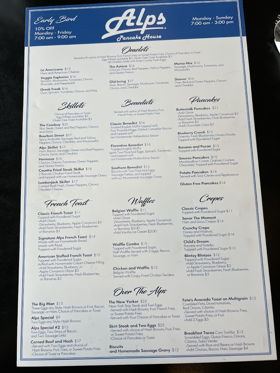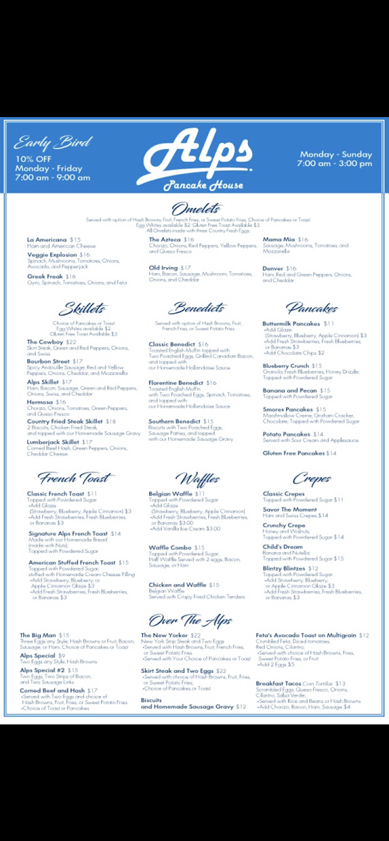 Welcome to Alps Pancake House, a bustling breakfast spot located at 3637 W Irving Park Rd in Chicago. Known for their warm atmosphere and exceptional service, this eatery specializes in a delectable range of breakfast options that cater to all tastes. The menu features fluffy pancakes, tender Country Fried Steak skillets, and innovative dishes like the blueberry cheese-filled blintz.